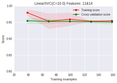 从上图上可以看出,过拟合问题也得到一定程度的缓解。不过我们这是自己观察后,手动选出11和14维特征。那能不能自动进行特征组合和选择呢,其实我们当然可以遍历特征的组合样式,然后再进行特征选择(前提依旧是这里特征的维度不高,如果高的话,遍历所有的组合是一个非常非常非常耗时的过程!!):